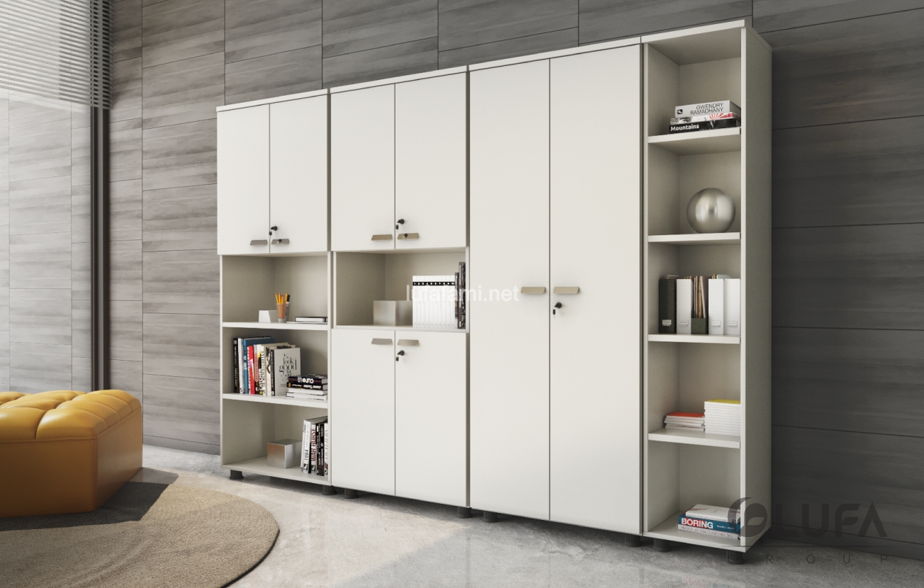 Kiểu dáng: Tủ gồm 5 ngăn. Tầng trên có 2 ngăn, cánh lửng. Tầng dưới có 2 ngăn, cánh lửng. Ở giữa có 1 ngăn không cánh.